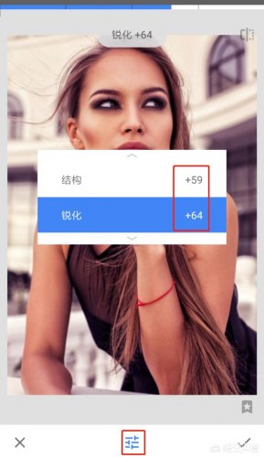 2、点击“工具”,选择“突出细节”,点击下面的参数调整图标,对“结构”和“锐化”进行适度调整即可,点“√”确认。下面是案例参数设置:3、确认效果以后,点击“导出”将调整好的照片保存在手机上即可。