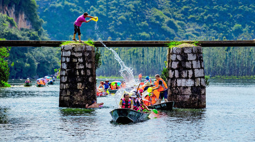 普者黑中心景区有16个湖泊2万余亩水面,似串串珍珠穿连在一起,形成19.8公里旅游航道。在波光粼粼、碧水汪汪的湖泊中行船,湖边雄伟飘渺,诡异出奇的峰林令人陶醉;放眼望去,远山如黛,湖光泛色,碧水连天,山峦青翠,山林野趣,浑然天成,犹如海山环抱的人间仙境;游客 荡舟其间,如在画廊中穿行。仲夏近万亩洁如白玉、红若孤仙的荷花洒满万倾水面,如珊珊走来的爱神,恍如别有锦天的荷花仙子降临人间。