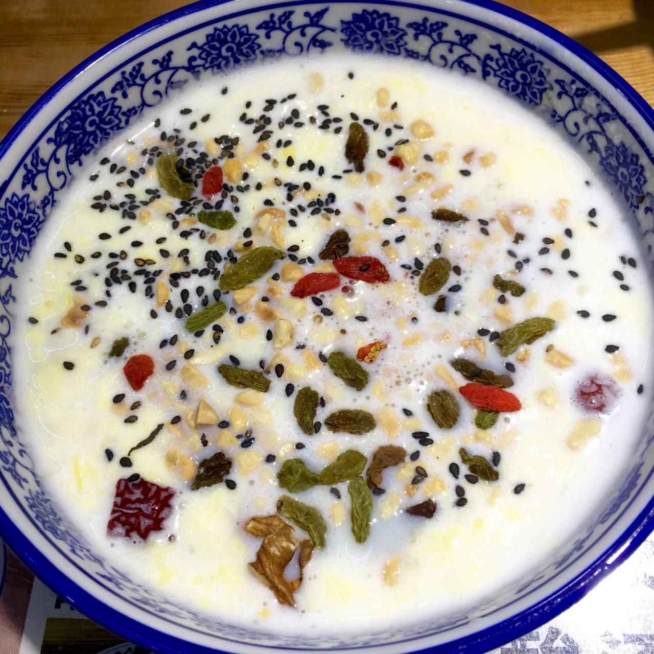 顾名思义,牛奶鸡蛋醪糟就是用牛奶、鸡蛋、醪糟一起煮制而成,首先把醪糟放在牛奶中烧开,打入鸡蛋花,并撒入葡萄干、枸杞、花生、白糖等,最后再撒上黑、白芝麻,成品黄白相间,味道滑嫩柔软,香甜偏酸。