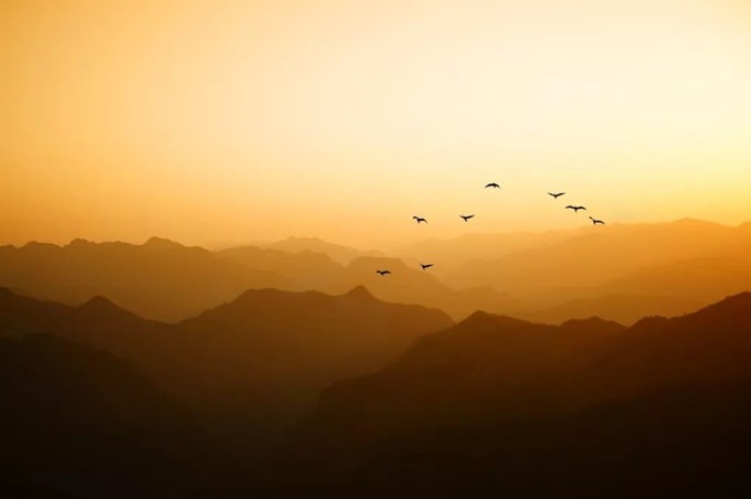 日暮夕沉,天地一片暗黄色,归鸟入镜,颇有些“落霞与孤鹜齐飞”之感。