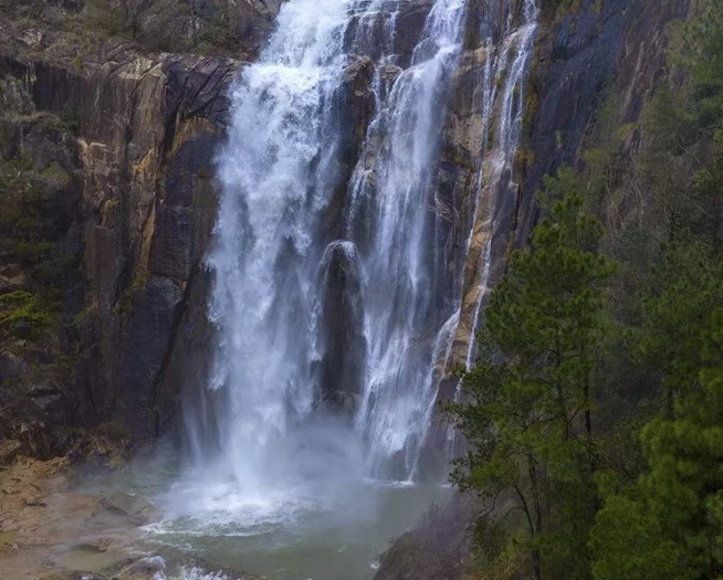 九级飞瀑(九瀑:玉梭飞流、七八瀑:幽谷叠瀑、六瀑:悬瀑风雷、五瀑:阆苑仙葩、四瀑:群蛟争壑、一、二、三瀑:龙游三井、凌云栈道、观景平台、索桥、玻璃吊桥、登云梯、摩崖石刻等,水潭形态各异,可供游人亲水嬉戏,是我国罕见的亲水梯级瀑布群。九级瀑布犹如一幅立体画卷,倾泻而下,气势磅礴。她们有的犹如江南女子妩媚,绰约,缥缈,叠翠流碧、喷珠溅玉、玉女飞梭,亦真亦幻宛若仙女舞素练,婀娜曼妙、回眸顾盼;有的如汉子般奔腾决然、义无反顾、风雷贯谷,其气势磅礴、豪迈逐澜、纵横捭阖,疑是银河飞泄涤尘埃,一声声呐喊惊醒沉睡千年的山谷,壮怀激烈,千壑回声,万峰无语且听涛吟。