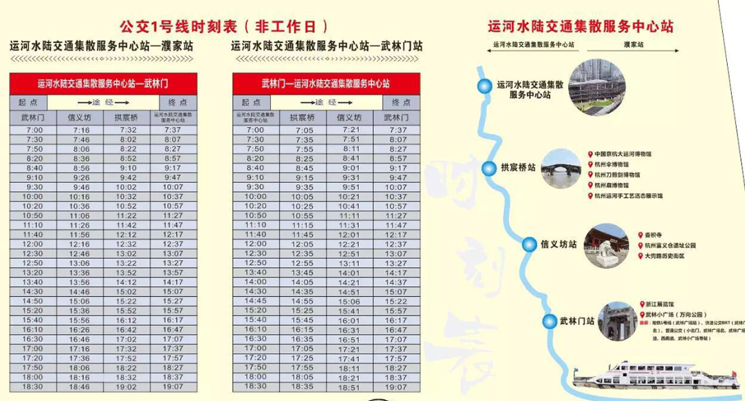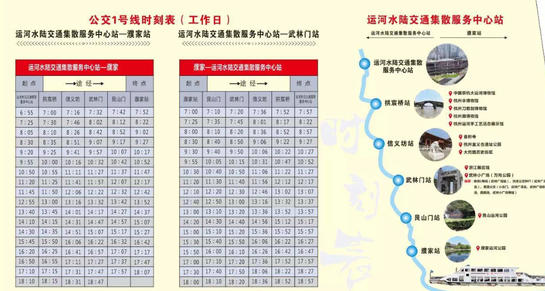 【分散游览交通方式】大兜路历史文化街区、小河直街:可公交和自驾到达,地图软件搜索相应地点即可到达。水上巴士:每天9:00—21:00,每小时一班(中午12点,晚上17点停班)。途径路段:武林门码头—香积古埠—小河直街码头—拱宸桥西码头—来回双向对开,沿途欣赏运河美丽风光,感受运河古老的历史文化,同时选择一个站点上岸游玩 后可再次凭票上船至另一站点(中间只可上岸一次)。 出发码头:武林门码头和拱宸桥西码头双向对开。 票价:30元/人(单程)