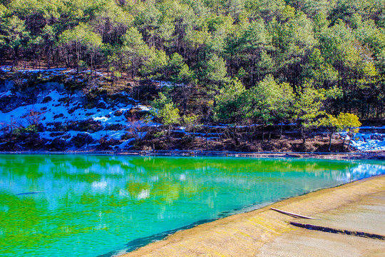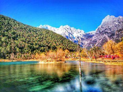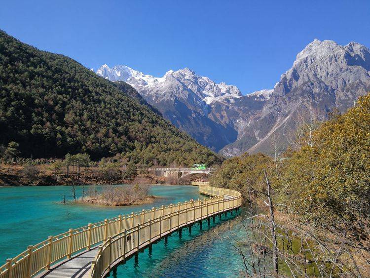 实际上我们除了到古城之外,古城周边的一些地方景色也非常的不错,今天介绍的是位于这里相对来说比较小众的一个地方,它位于山脚之下,这里的景色特别的美,湖水干净澄澈,看起来就像是蓝月一般。