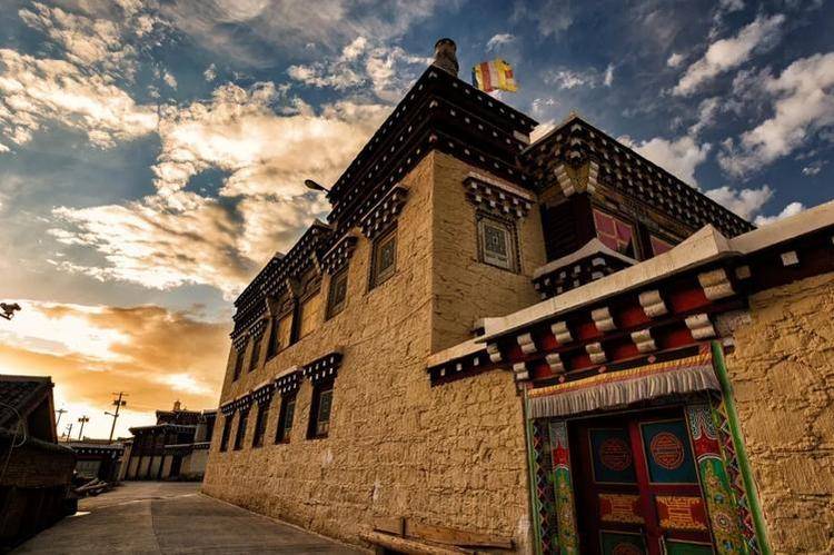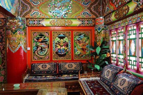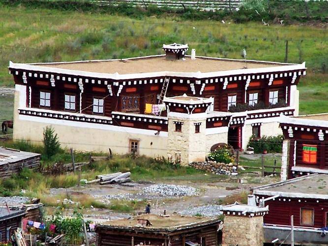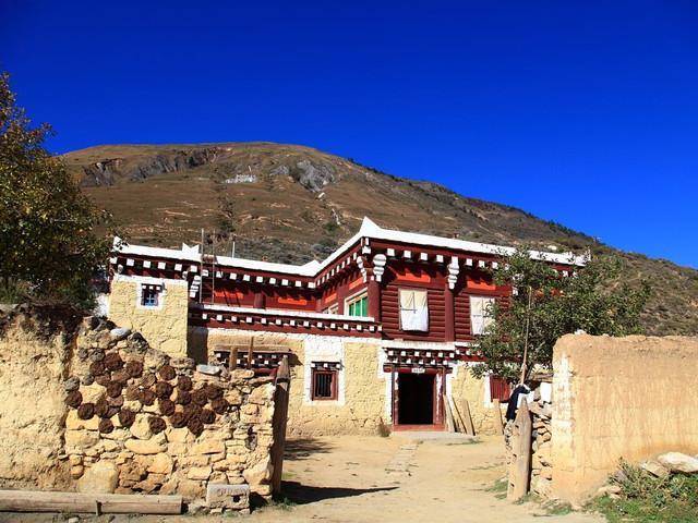 而这样一种白色墙体,棕色外柱的建筑物,配合着外面蓝色的天,白色的云以及远处碧绿的山岗,使得整个藏族民居仿佛镶嵌在,一幅自然景色中的白色百合花一样,既清丽又好看。