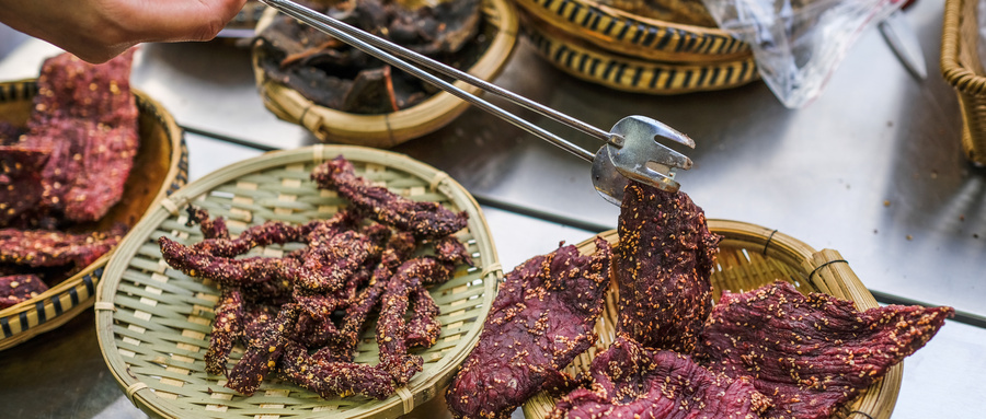 取较好的牛精肉切成条状肉块,抹上盐巴、辣椒、花椒、八角、草果面和酒腌上一至两天后,穿上竹条或细箭竹上,挂在灶房或火塘上方让火烟熏干备存。我觉得最好吃的制作方式是,把肉切成小片油炸。