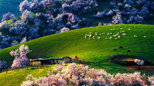 伊犁杏花沟,位于新疆伊犁新源县吐尔根乡,是一片中世纪遗留最大的原始野杏林。每年杏花绽开时,大片大片白色的杏花错落有致的洒落在绿色起伏的山坡上,既芳香扑鼻又美不胜收。