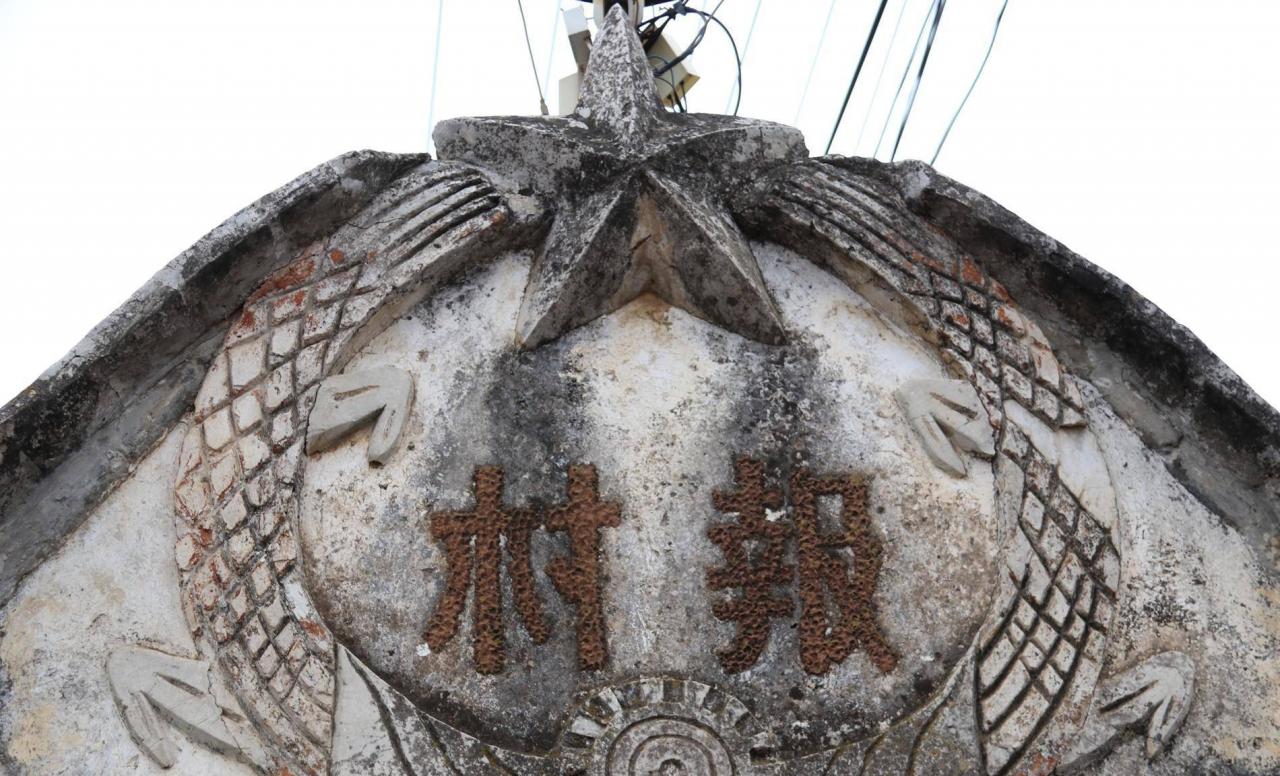 照壁原来应该有别的图案,不过到了上世纪五六十年代,这里一度改作了村里的“村报”栏,最上面也加上了旗帜和五角星的雕饰。