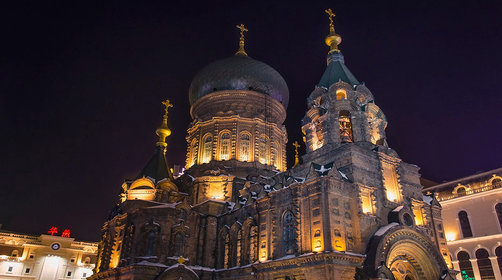 圣索菲亚大教堂是远东地区最大的东正教堂。始建国土1907年3月,是沙俄东西伯利亚第四步兵师修建的随军教堂。后重建,直至1932年落成。它是目前中国保存最完美的典型拜占庭式建筑,这座诞生近百年的建筑宏伟壮观,古朴典雅,充溢着迷人的色彩。