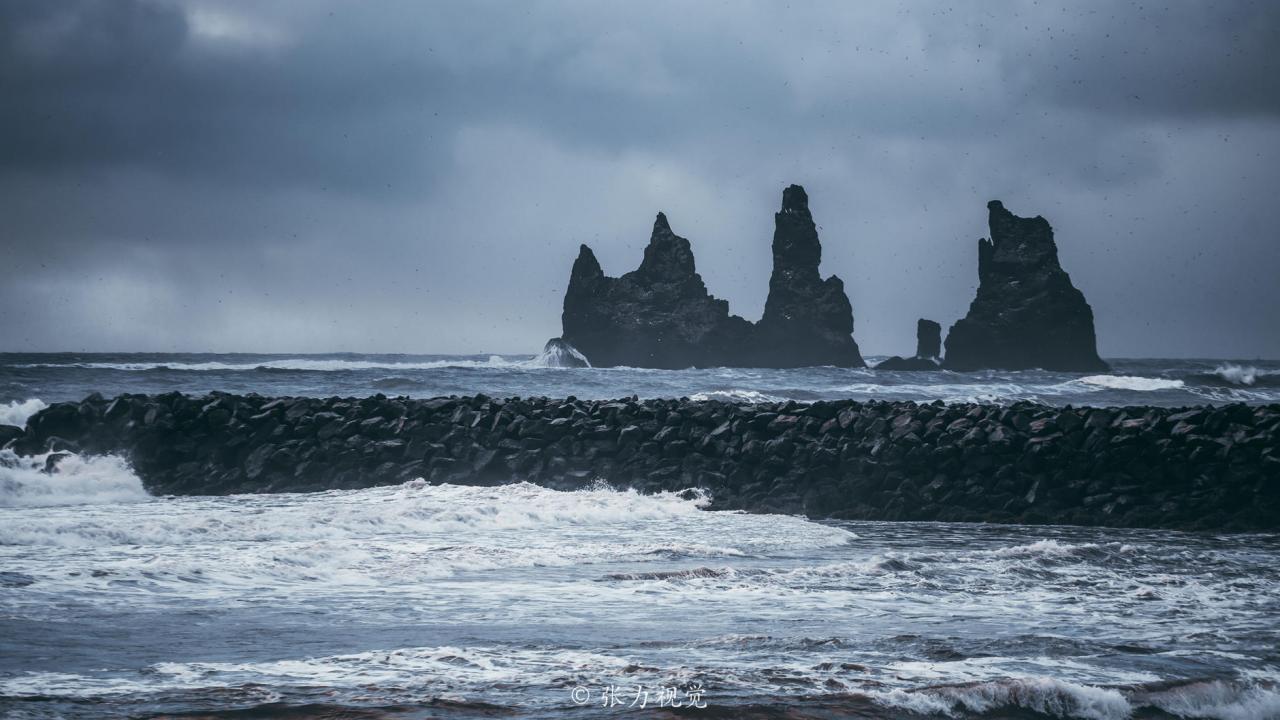如果看够了黄金沙滩,可以来冰岛看一看黑沙滩,黑沙滩的“沙子”来自于火山熔岩。经过海风与海浪的雕琢,黑色的玄武岩变成了黑沙,缥缈阴郁的气质,多了几分超现实感。而最著名的黑沙滩当然要数位于维克小镇附近的Reynisfjara。经常有摄制组到这里取景拍摄外星球等科幻类型的影片。壮观的雷尼斯德兰格(Reynisdrangar)石柱屹立在此。传说中这两根石柱是夜巨人见到清晨的第一缕阳光化身而成。六边形的玄武岩柱围绕在海滩周围,海鸟盘旋其间,展现着如异世般的壮美景色。