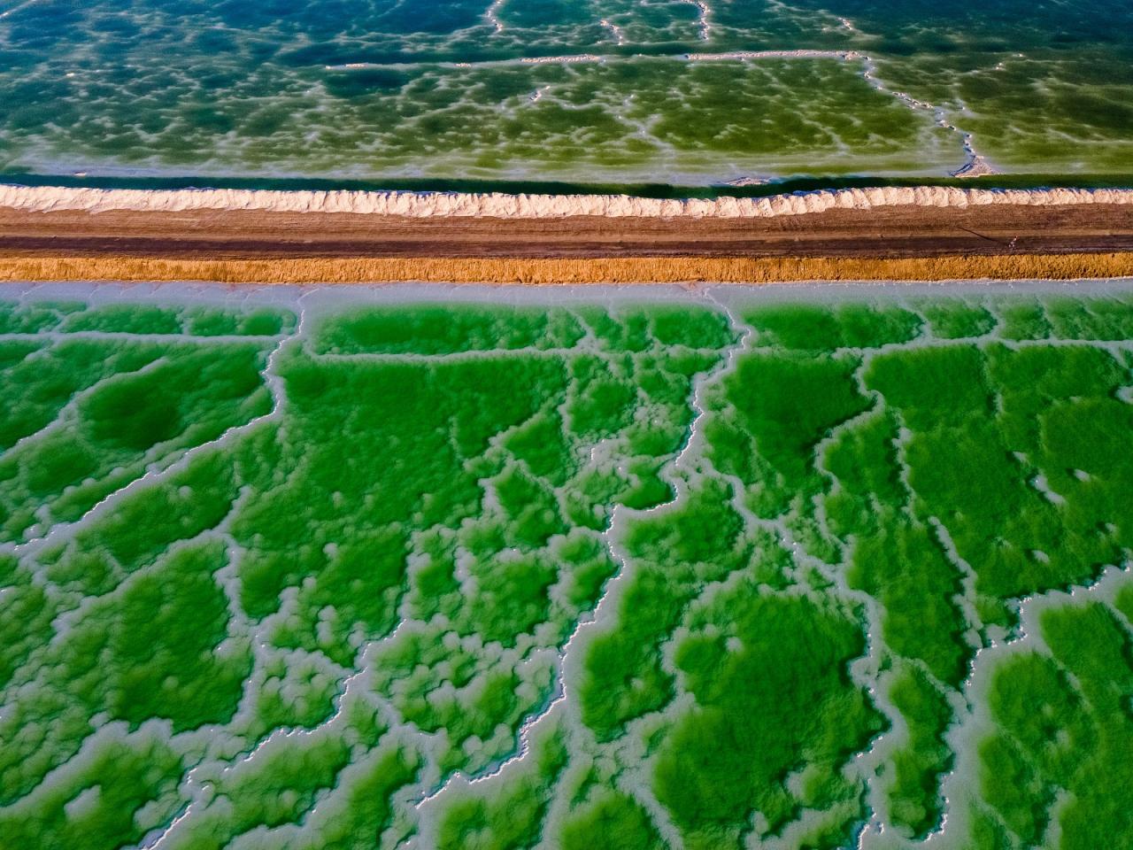 这是一处因其颜值太美近期开始越来越火的网红打卡地,它是一个人工盐湖,田字状的湖水呈现出油画色彩。湖面积约26平方公里,平均深度0.5米,属于硫酸镁亚型盐湖,经过钾肥工人十几年精心的“养颜”,水的颜色纯美剔透,如同镶嵌在戈壁的璞玉。