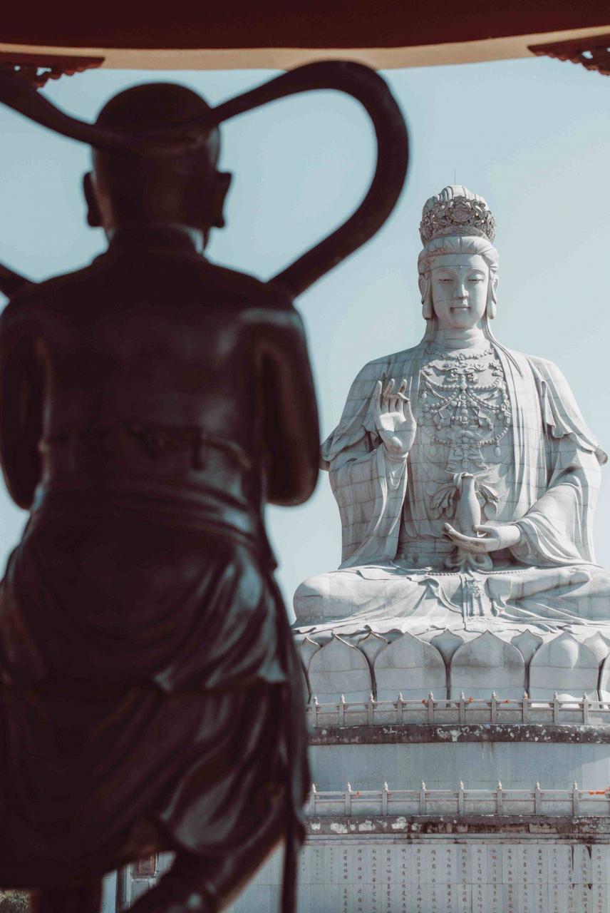 来此祈福许愿,自然需要拜观音。在观音山山顶的观音广场上,伫立着一尊世界最大的花岗岩观音像。遥遥望去,慈眉善目的观世音菩萨手持玉净瓶,端坐于莲花台上。越走进这个高达三十多米的观音圣像,愈发能感受到那份庄严肃穆。在香炉前停下脚步,虔诚地上香祈福。无论是求姻缘,还是求事业,亦或是求来年平安,只要心诚志坚,神灵定会保佑心愿实现。观音圣像旁,几座庙宇殿堂错落有致。朱红的墙壁与金黄的屋檐巧妙地结合在一起,精美的彩绘也融合其中,尽显中式传统建筑的古典韵味。