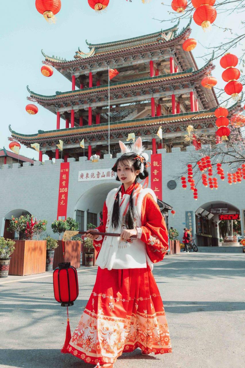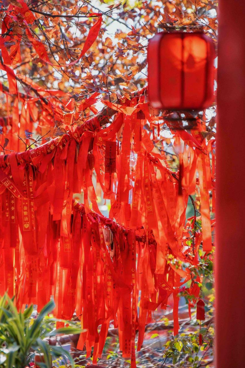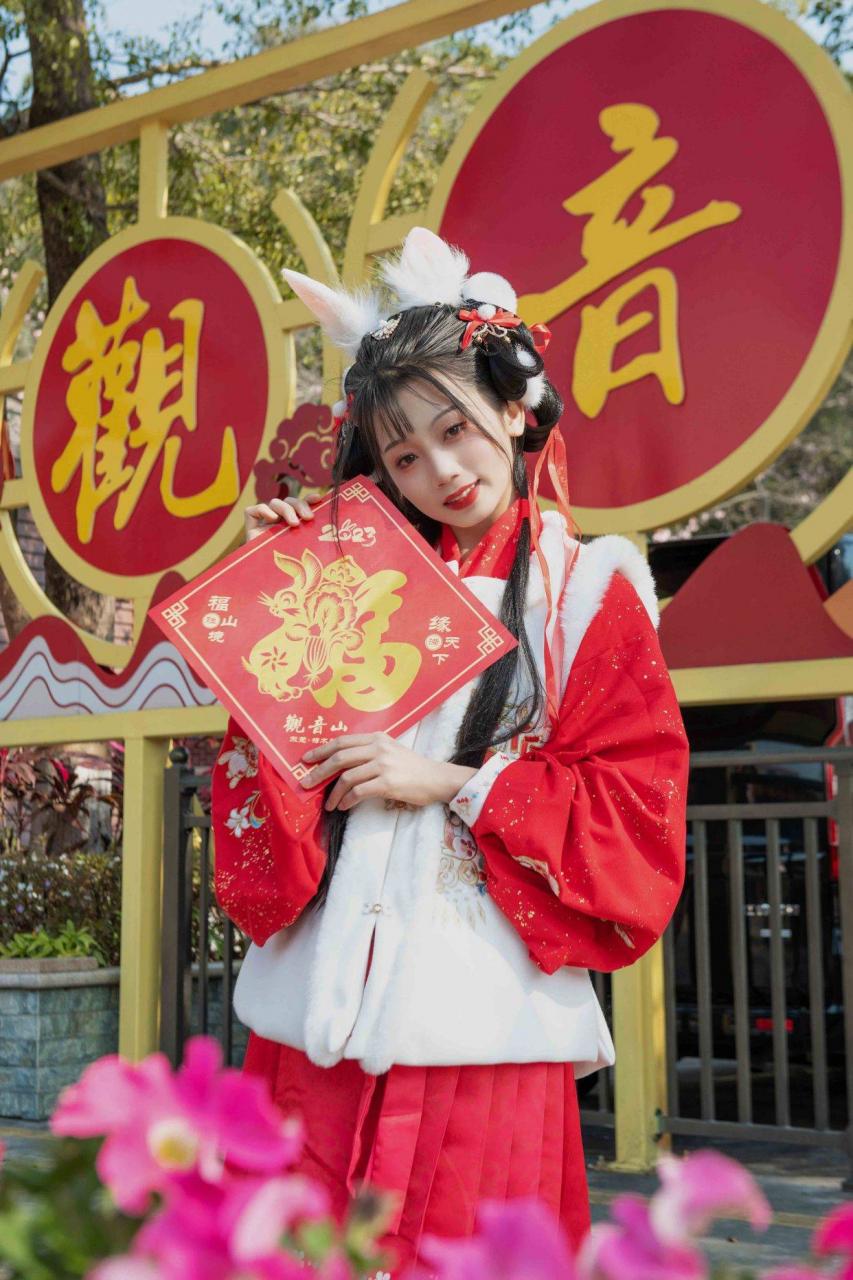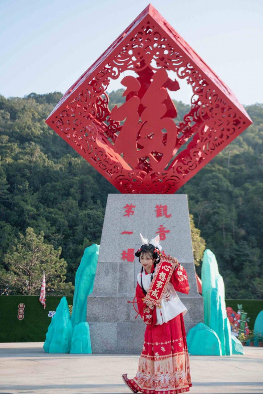 新春之际的观音山,到处都被“红色元素”装点。对于中华儿女来说,红色是有着美好寓意的颜色。它代表着吉祥,也代表着喜庆。看着景区里高高悬挂着的大红灯笼和随风飘扬的许愿红丝带,眼前不由得浮现出喜气洋洋的新年景象。若细心观察,还能发现分散在各处的兔年福字贴,这都是为了迎接2023年新春而特意准备的。置身其中,热闹吉祥的新年。