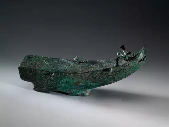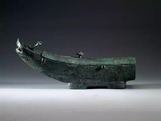 铜质。通体为角状,前端做龙首形,露齿昂翘,瞠目张角,龇牙咧嘴为流。盖面饰逶迤的龙体花纹与前端龙首衔接,衬涡旋纹。腹两侧各置一对贯耳用于悬挂;以涡纹、云纹为衬托,饰鼍纹和夔龙纹,头向与龙首相反,颇富动感。圈足饰相对的夔龙纹,更增稳定之感。整体造型奇特,独具风采。纹饰粗犷,线条流畅明快,特别是鼍纹在青铜器中极为少见。属商代晚期风格。