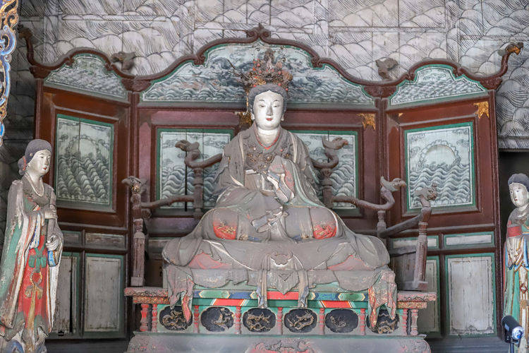 正中央的主像就是圣母邑姜,旁边的彩塑是待女、宦官和仕女,