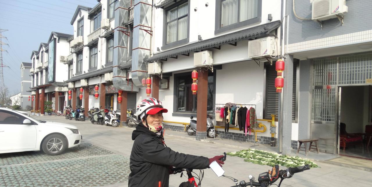 有一排三层连体别墅,一共16间门面房,14间成了一个饭店,最东边两间联体别墅主人自己住,在这房人家门前支好自行车下车看看。
