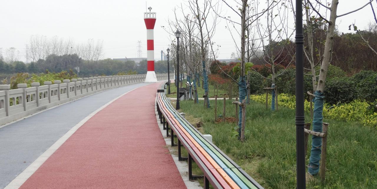 路左的景观常绿树上掛满夜晚灯光秀装置,路边长条櫈有几百米长,供游人们晚间河边欣赏京杭大运河百舸争流的美景。