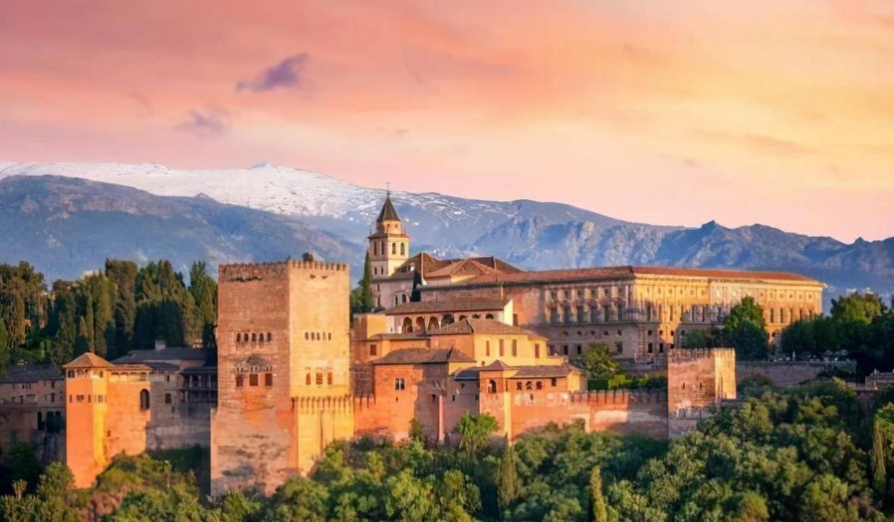 位于西班牙南部格拉纳达著名的阿尔罕布拉宫,建于1238年至1358年之间,是来自北非的摩尔人杰作。阿尔罕布拉宫这个名字来自于一个阿拉伯语短语,意思是红色的城堡,因为它的塔楼和墙壁的都是红色的。它建于一座山丘之上,被摩尔人诗人描述为 "镶嵌在绿宝石中的珍珠"。