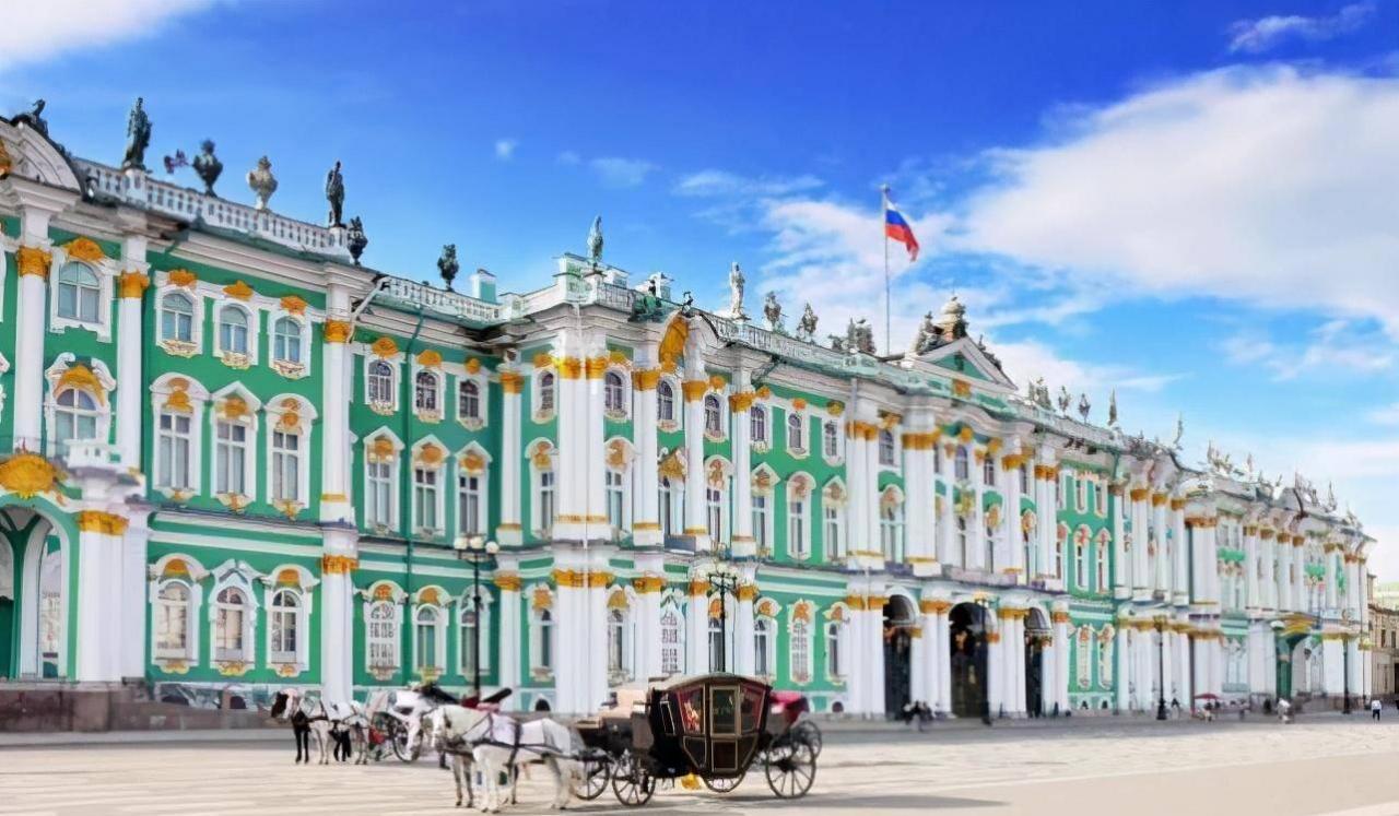 俄罗斯圣彼得堡冬宫,这是一座巴洛克风格的建筑,也是圣彼得堡最著名的地标和世界上装饰最豪华的宫殿之一。薄荷色、金色和象牙色的外观看起来就像一个大型婚礼蛋糕。今天看到的宫殿建于1730年至1837年之间,占地60,000平方米。现在这里已成为冬宫博物馆,它也是世界上最大的博物馆之一。