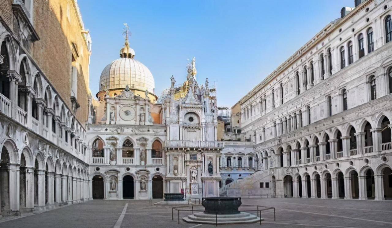 意大利威尼斯多杰宫,外表的华丽装饰一眼可见。但内部壮观的大厅、楼梯和房间才真正囊括了老威尼斯的精神。从威尼斯议会所在的大议会大厅到巨人楼梯,都有丰富的镏金色装饰。对游客来说很有趣的一点是,从中央庭院可以看出,这座宫殿其实并不是一个正方形,只有三面。第四面是由相邻的圣马可大教堂形成的。