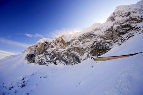 拍摄雪景也存在同样的问题,由于雪的亮度很高,如果按相机自己测算出的测光值曝光,会造成曝光不足,使拍摄出的雪呈灰色,所以拍摄雪景时一般都要使用曝光补偿功能对曝光进行修正,根据雪景在画面中所占的比例,通常需要增加1至2挡曝光补偿。左侧展示了需要增加曝光补偿才能够拍摄出的美景。