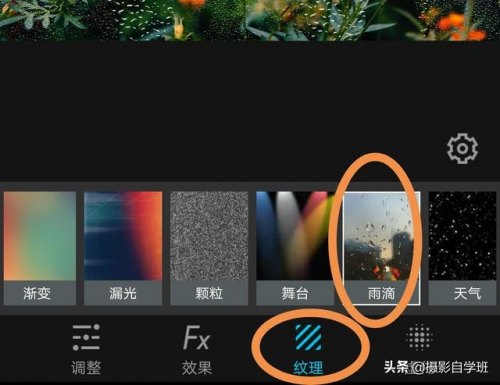 (2)在图片下方,找到文字中的“纹理”,点它。在上方小图中,找到“雨滴”,点它。