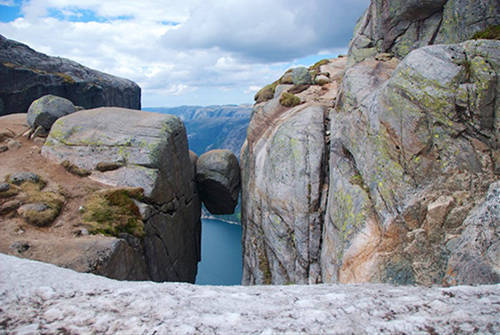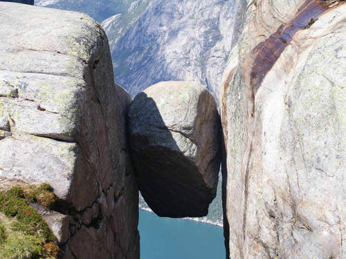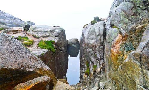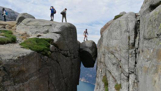 在挪威有一处景点非常适合爱冒险的游客前来,没有胆量的人来到这个景区怕是会被吓得腿软。这个景点非常有特色,在两座悬崖中间卡着一块大石头,这块石头怎么看都与这两座峭壁格格不入,仿佛随时都会掉下去,但是这块石头偏偏在这里卡的很紧,多年来都没有掉入下面的万丈深渊。