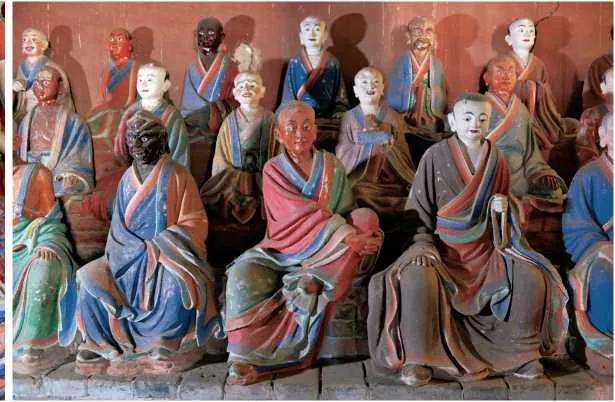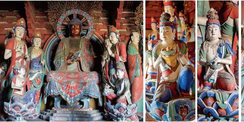 这个最古老的建筑是五台山的东大殿,建于唐大中十一年(857年),由唐朝长安一位名叫宁公遇的女信徒捐赠而成。殿内有35尊彩塑,均为唐代作品,其中一尊为唐代贵妇,供养人的塑像,当年林徽因还与之合影,或许心底也感谢这位女施主的善良,给我们留下了这华丽的艺术作品。另外500罗汉是明代的彩塑。