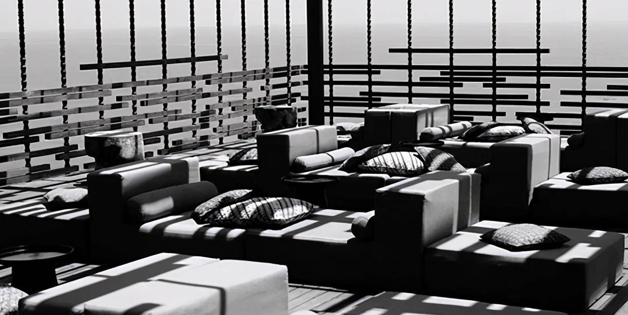 还是大堂,三面通透的大堂分毫无阻地让粼粼波光反射到了天花板上,形成一幅流动的画。此外酒店室内泳池上空,倾斜设计的屋顶开着大小不等的小窗,当阳光洒下,又是一幅美丽的图案,此处据说是效仿阿拉伯阿尔罕布拉宫的星夜浴室。这些是自然光,那人造光呢?