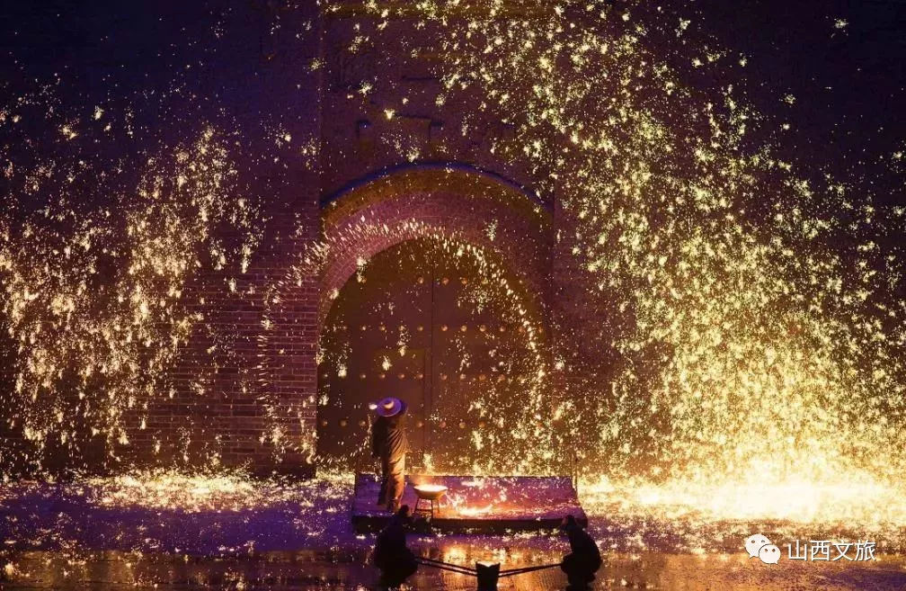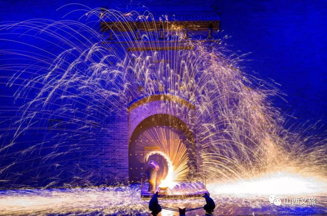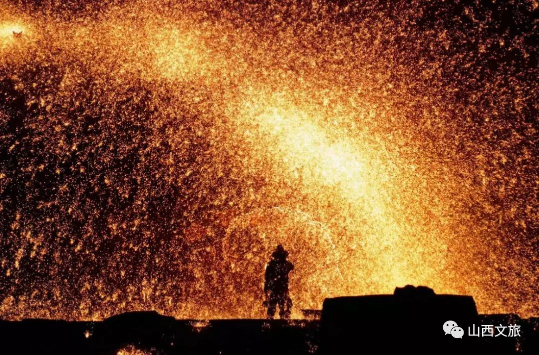 一场传承几百年的“打树花”,人们泼洒铁水,迸溅形成火花,犹如烟花雨。