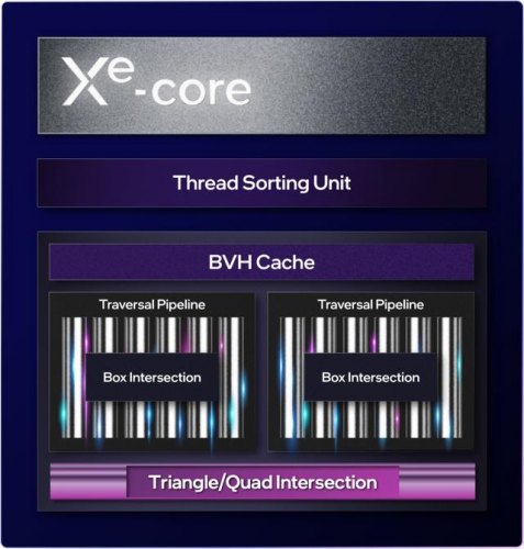 英特尔锐炫 A 系列产品全部基于 Xe HPG 架构打造,包含了强大的 AI 引擎和增强的媒体引擎。新的 Xe 显示引擎和新的图形管线引入其中,用来处理各种不同显示任务。每 4 个 Xe 内核组成一个渲染切片,而每一个 Xe 内核中都配备了数量可观的运算单元,如矢量引擎 XVE,矩阵引擎 XMX。此外 Xe HPG 也集成了其它主流图形技术,如网格着色,采样器反馈等,在渲染切片中都能够找到其相应的硬件支持。