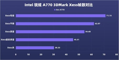 Xess 的具体效果怎么样呢?我们可以借用 3DMark 提供的 Xess BenchMark。从中我们能直观的看出 Xess 对游戏帧数巨大的提升。