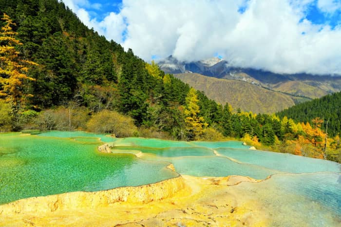 四川阿坝州环线自助旅游攻略简介之黄龙景区,推荐指数五颗星,黄龙与九寨沟一山之隔,奇妙之处是沟底的岩石晶莹光滑,顺着山沟曲折蜿蜒,犹如一条黄龙盘旋而上,黄龙寺后约一平方公里范围为黄龙景区的黄金景区,距后寺背面不到100米,有一龙王庙,每年一度的黄龙庙即在此举行,黄龙后寺之背是黄龙沟最高的池群石塔镇海,如果游黄龙不到石塔镇海池,便是大大的遗憾。