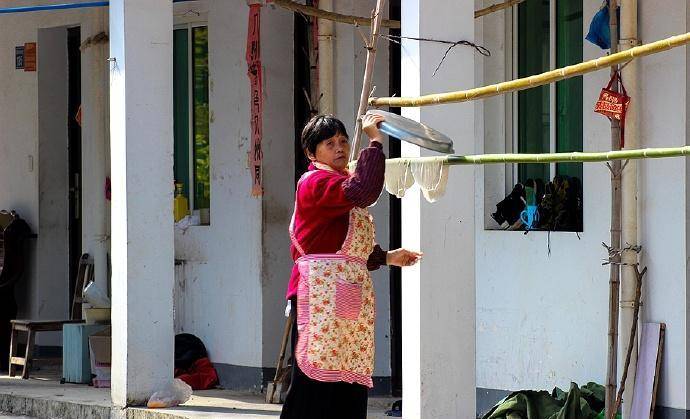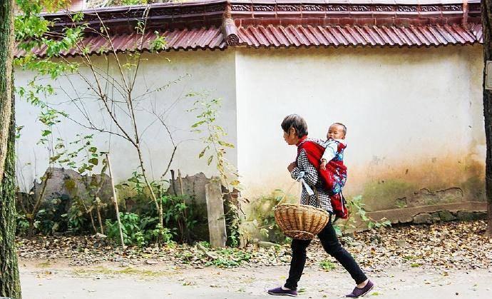 村子里很安静,身边走过一位老妇,只见她用专门背孩子的绑带背着孩子,胳膊上还挎着个大竹篮子。
