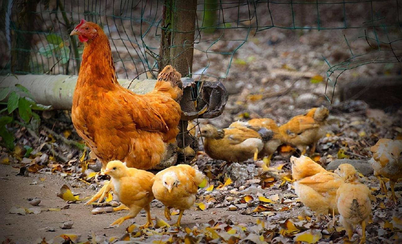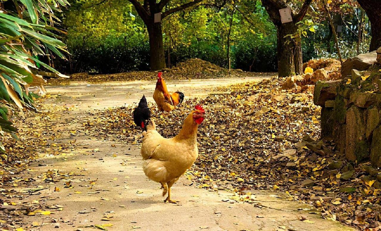 看到一群鸡不紧不慢地散步、刨土、捉虫子觅食。