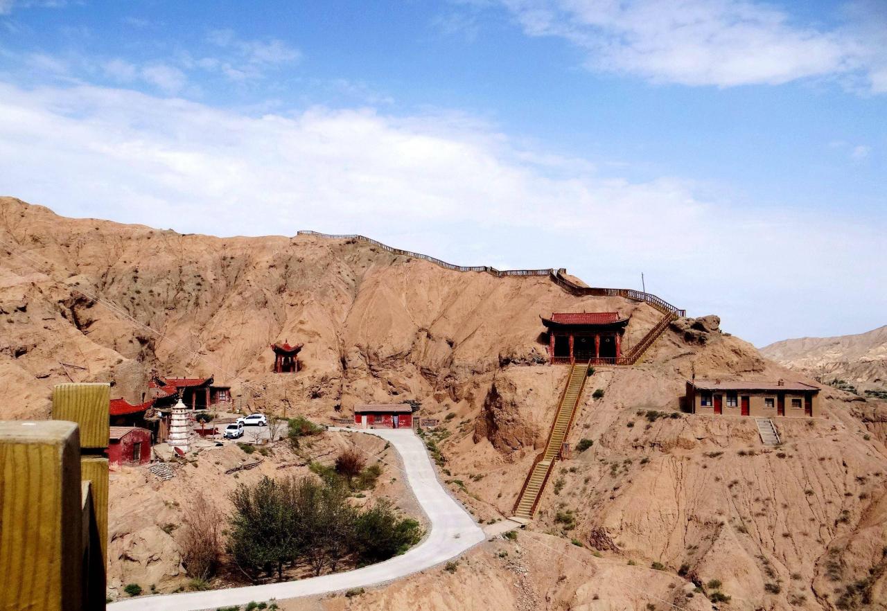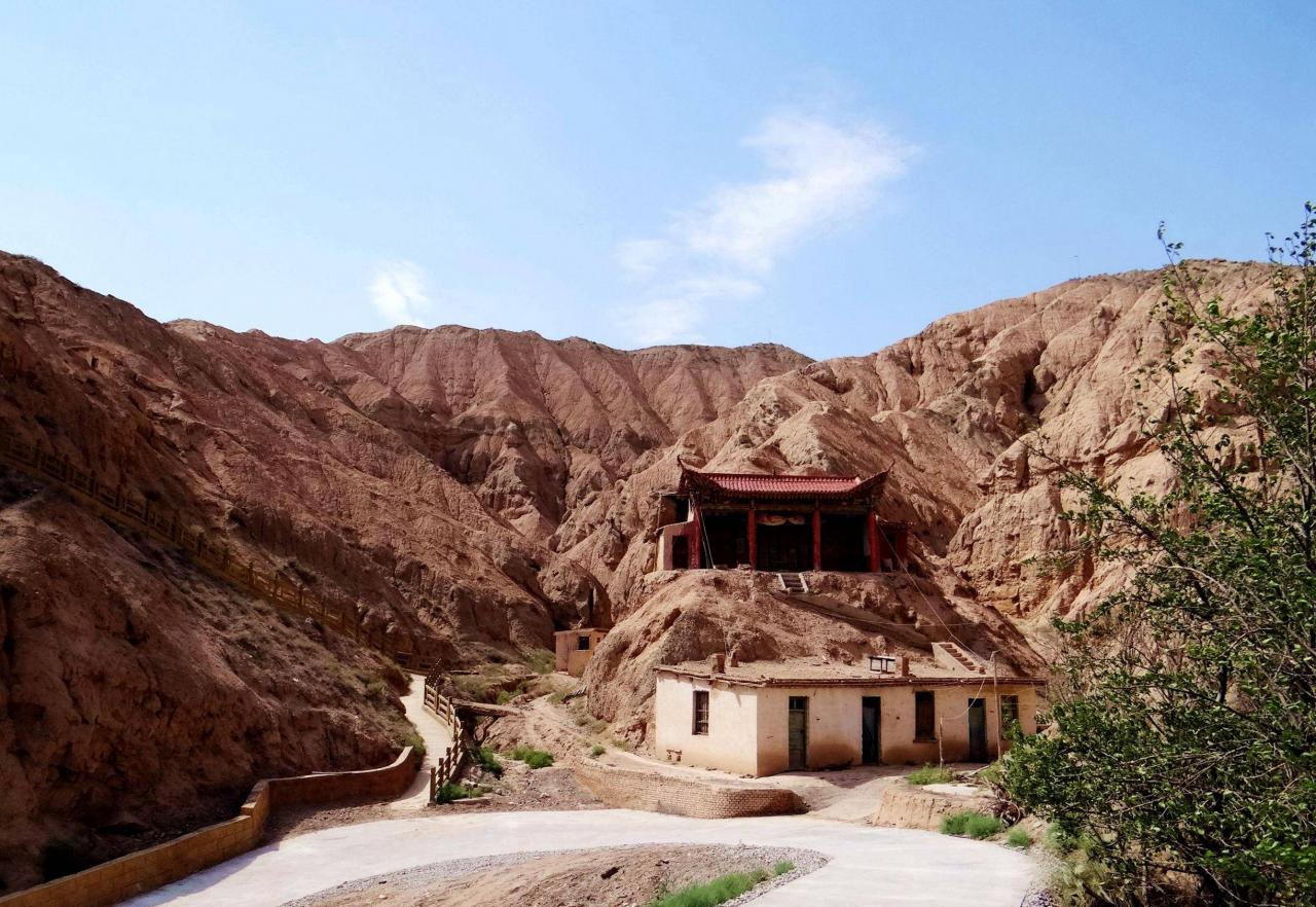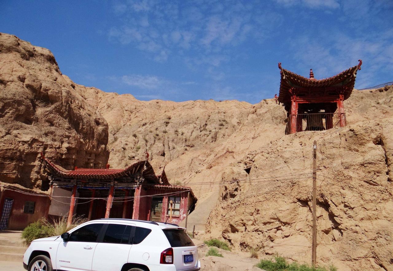 文殊山,在元代之前名为嘉峪山,直到明代才改称为文殊山。它是祁连山的支脉,山峰在此处形成一个峡谷,石窟群就是建立在这个峡谷的崖壁之上。景区的道路虽然不是太宽,但是基本平坦整洁。整个景区几乎看不到管理人员,车辆可以随意停靠,而且在我们将近两个小时的游览过程中,没有发现其他游客。