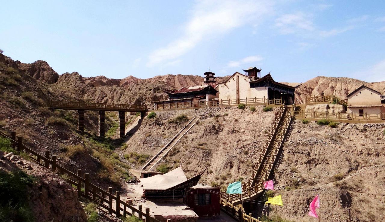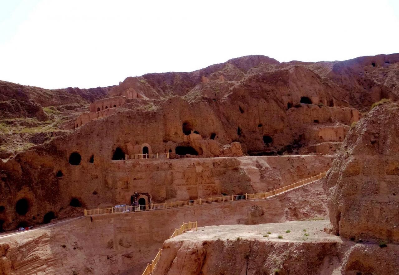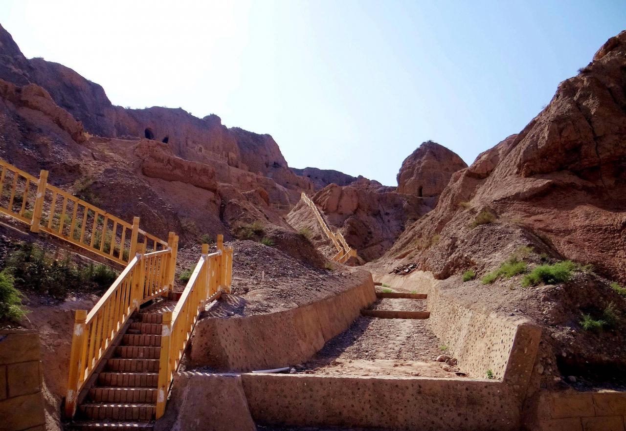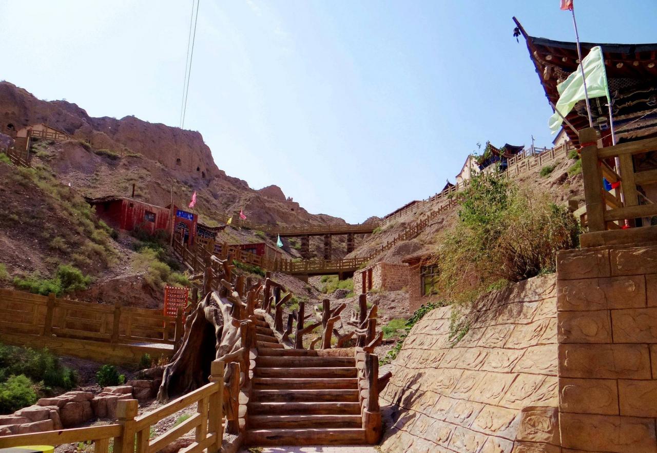 站在峡谷底部,环顾四周,大小寺庙建筑和洞窟星罗棋布,遍地开花。从外观看,部分建筑显然是经过维修装饰,在建筑之间也修建了水泥道路或者是木质栈道,看来景区管理还是做过相当的投入。