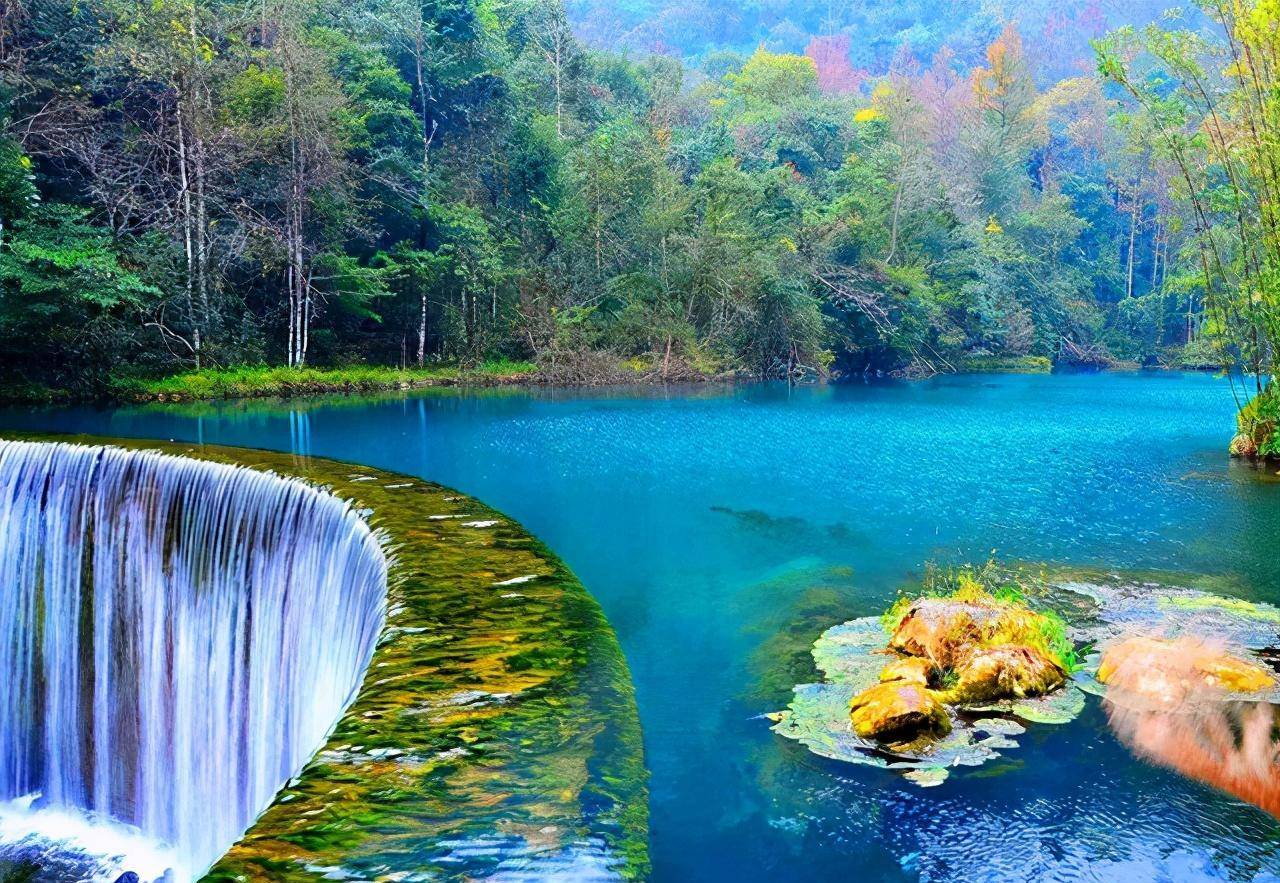 色彩斑斓的卧龙潭和卧龙潭瀑布,与九寨沟仙境有得一拼。