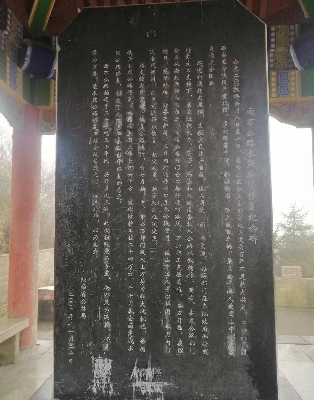 2002年夏季,秦岭山区和陕南部分地区遭遇百年不遇特大洪灾,西万公路西安至宁陕段水毁严重,多处路基冲溃,桥涵坍塌,车辆被困,交通阻断,陕西投入了上万劳力和大批机械,用时4个月才完成修复,现在,在秦岭分水梁上还有一块纪念碑,记载了这次抢险修复的事情。