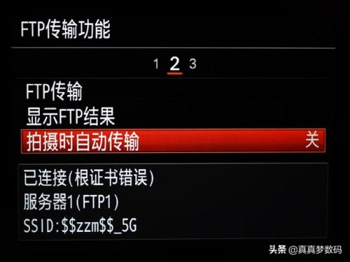 进入FTP传输功能的第二页,如图,如果你经常在家或者工作场所拍摄,可以将拍摄时自动传输设置为开,这样只要检测到你拍摄了新的照片,就会立即将照片在后台传输到FTP服务器里, 拍完就不用再手动进行备份了。