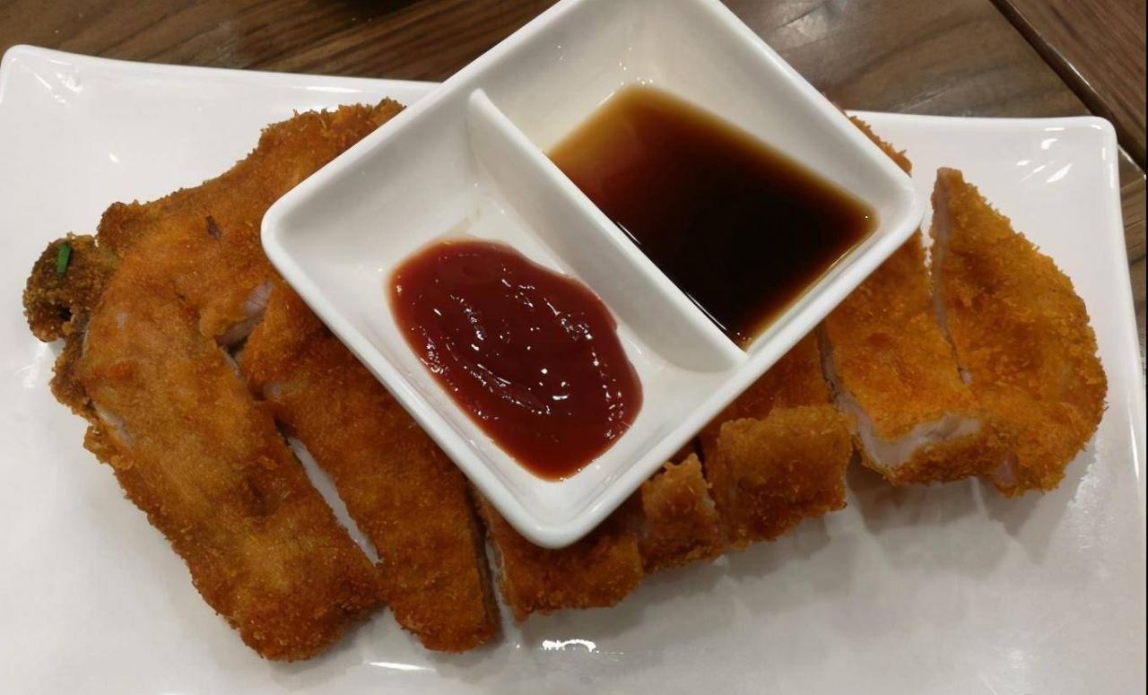 这道炸猪排,是店家推荐我们的网红菜。猪排切得很薄,皮很脆,很香,小朋友们的最爱。