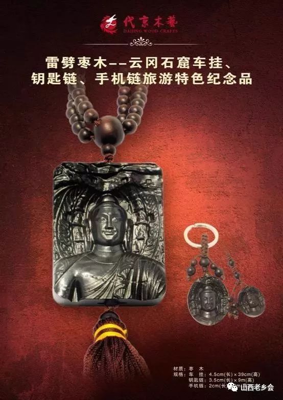 相传被雷击的枣木具有神灵之气运,佩戴于身不但可以抵御邪恶之气,近身还可带来祥瑞和幸运,欢雷劈枣木做成的云冈大佛车挂、钥匙链、手机链旅游产品不但体现了浓厚的山西旅游文化内涵,更是宣传和扩展山西旅游知名度的最佳形式,加之雕刻云冈大佛佛像使其更具有辟邪消灾、护佑平安的灵圣旅游纪念佳品,深受广大游客喜。