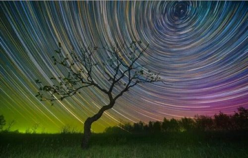 换句话说,星星看上去是会慢慢移动的。如果你固定不动长时间曝光拍摄星空,星星就不再是一个点,而会拖成一条弧线,这就是星轨。
