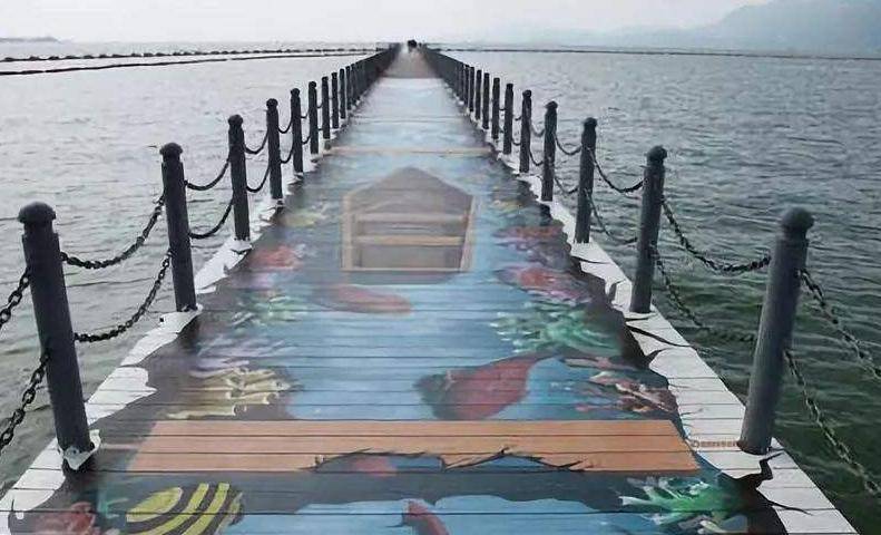 海埂公园的一个小景点,就是玻璃栈道,票价是25元一个人,但是昆明旅游消费券可以用,就相当是免费,入眼就是蓝色和白色的铁门。而且还是拱门的形状,再往前面走就是木板与玻璃合成的的桥。十分的长,在桥的两边有着链条围绕,中间的桥面十分的色彩斑斓,有着很多的创意涂鸦。