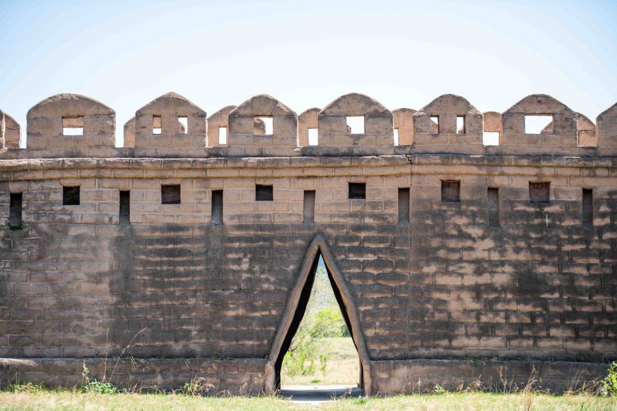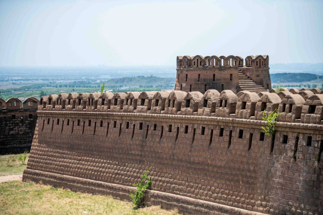 城堡区由城墙、城门、墙堡和塔楼等组成,从东向西分三层三段,为不闭合式仿西亚古城风格的建筑,与举世闻名的大窑文化遗址南北相望。由此顺沟而入,过古烽台、跨赵长城,即见到影视城的又一仿古建筑——仿居庸关城门。雄踞神水梁上的仿古城墙,依山势而建,蜿蜒磅礴,别有一番神韵。在距神水梁城堡约2公里的山顶上,建有一座穹庐式的金顶大帐,大帐背依蒙古族祭奠和汲取神水的敖包。