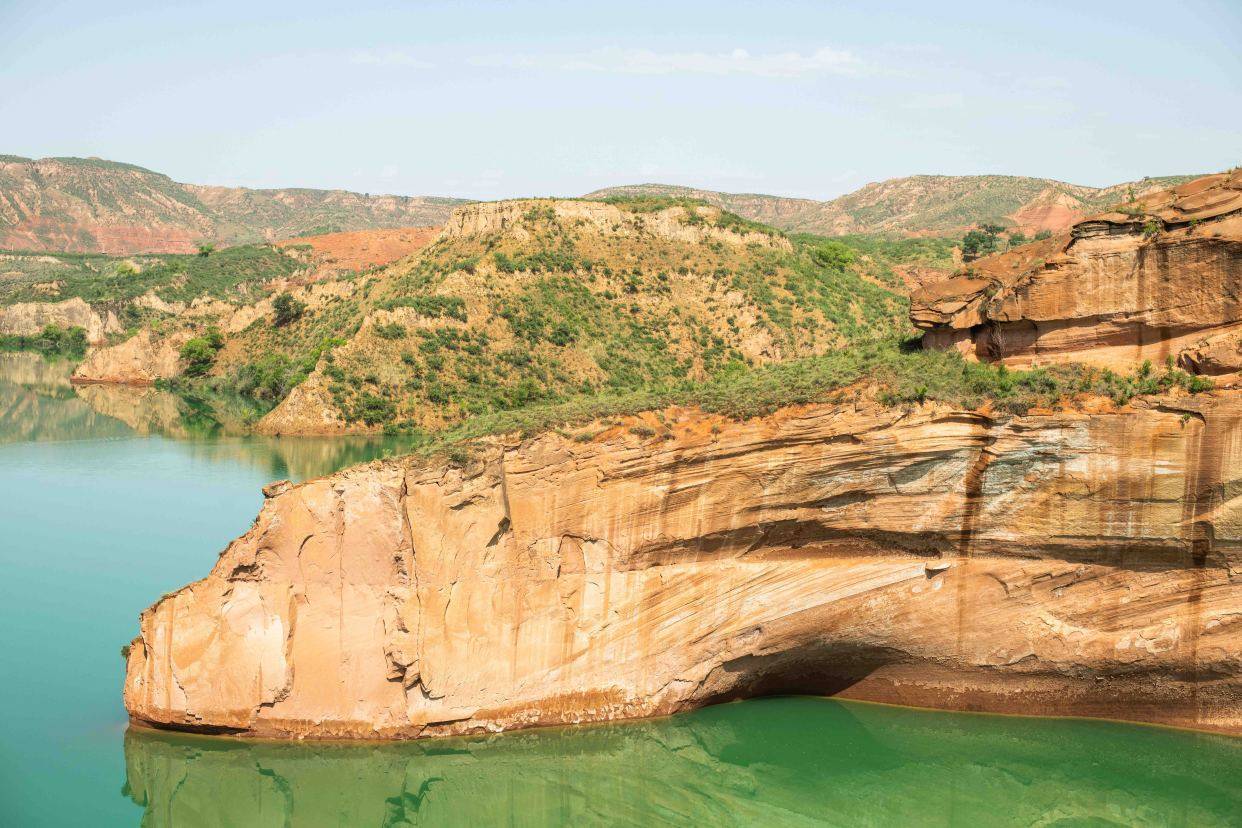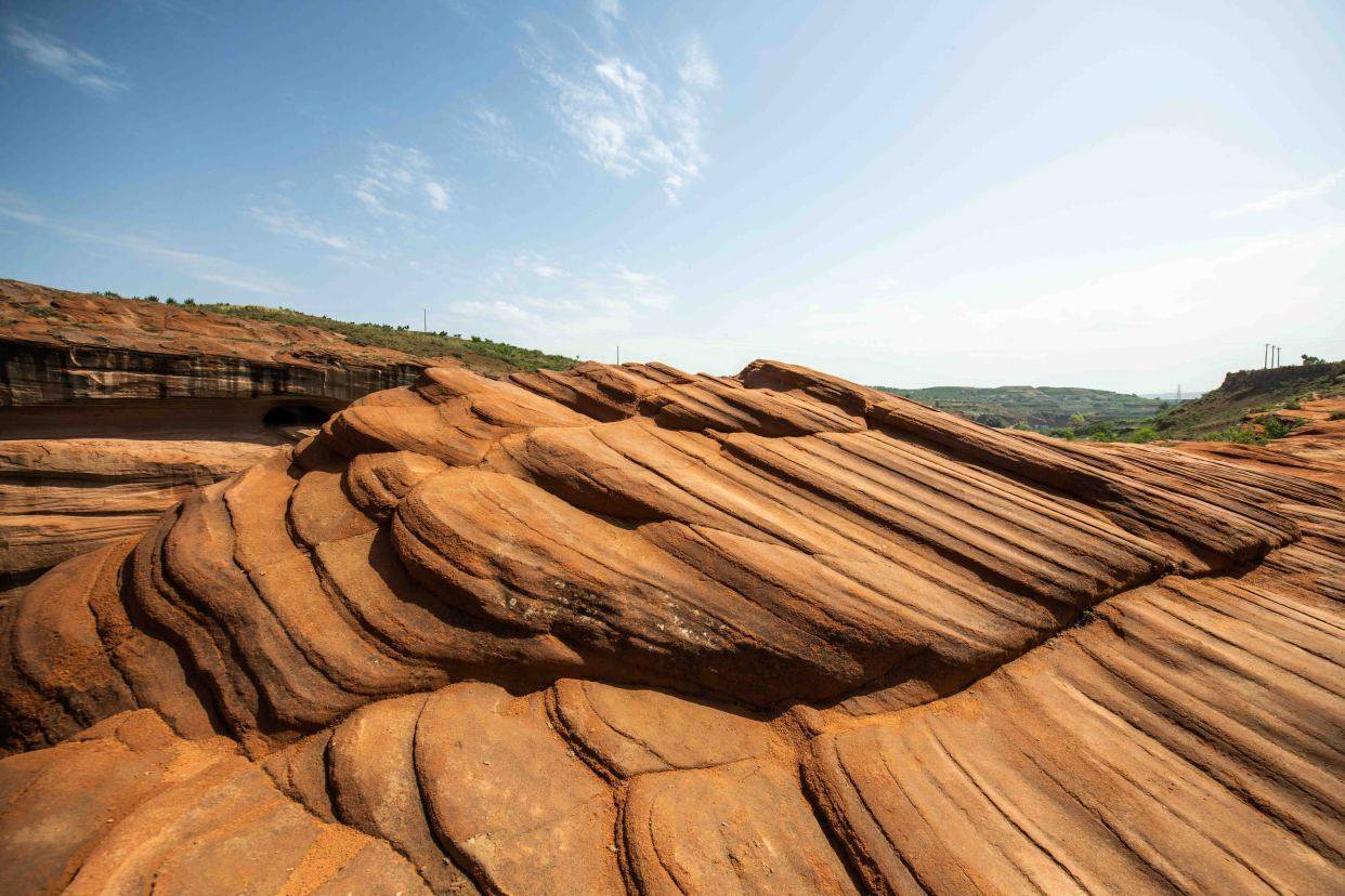 西北的风沙没有摧毁这座峡谷,反而让它碰撞出不一样的热烈色彩,红色石头如同泥石流般迸发出一种流动感,一圈圈地向沟壑中流去,层层叠叠的石头仿佛浸染过后铺在大地上的红色丝绸,一卷一卷地在夕阳的渲染下异常夺目,又似黄土中冒出来的红水缓慢向低处流动,如同柳宗元发现小石潭奥秘般,沿着红砂岩的踪迹继续寻找,眼前便豁然开朗,一条峡谷似的河沟便横亘眼前,红色石头全部呈水流状凝固,如同一根根赤色的冰挂,有似一股股封冻的岩浆,与沟底的细流和远处的绿色植被交相辉映。