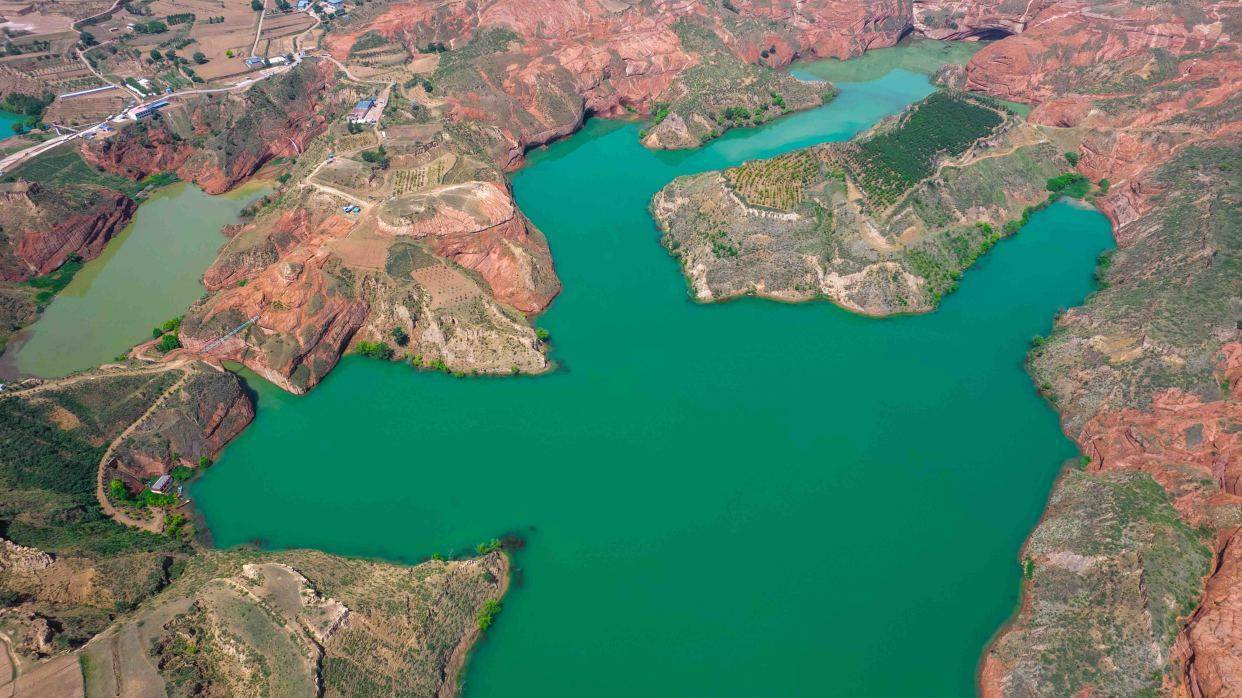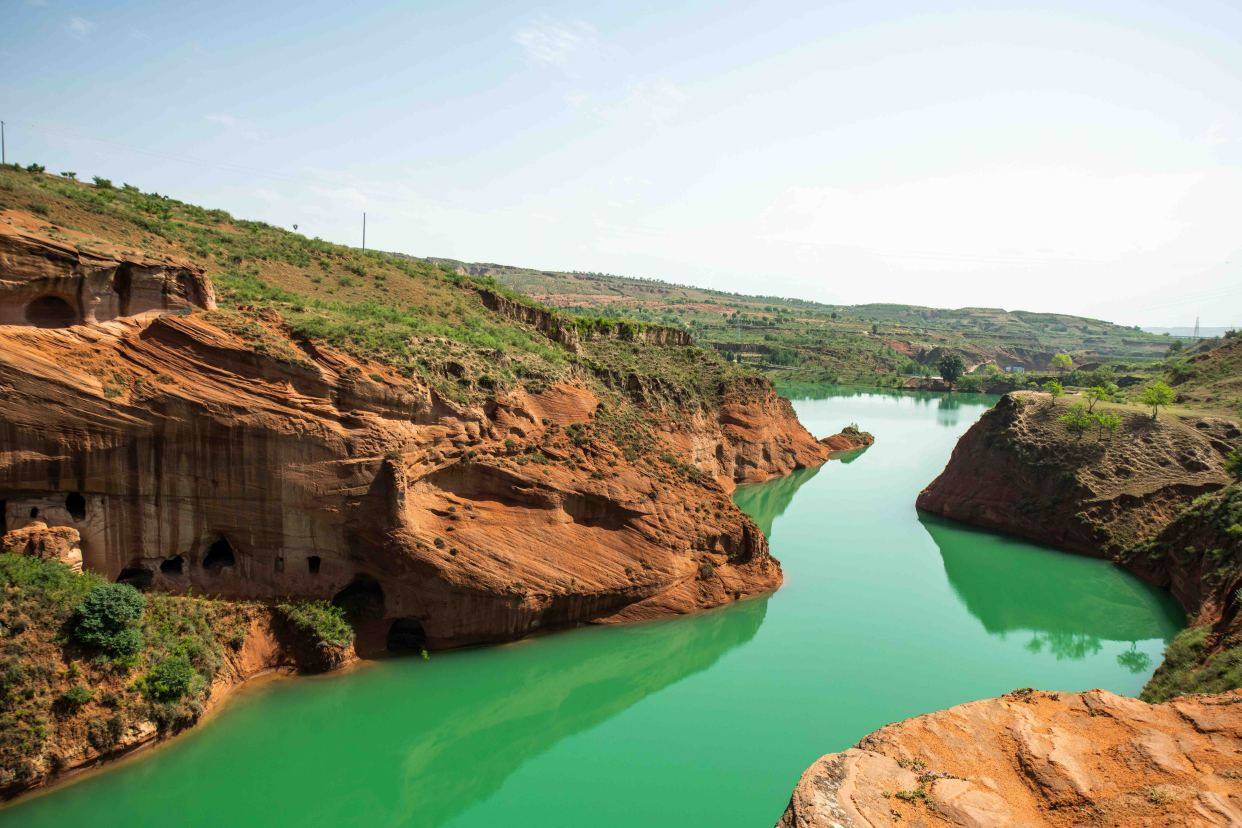 西北的风沙没有摧毁这座峡谷,反而让它碰撞出不一样的热烈色彩,红色石头如同泥石流般迸发出一种流动感,一圈圈地向沟壑中流去,层层叠叠的石头仿佛浸染过后铺在大地上的红色丝绸,一卷一卷地在夕阳的渲染下异常夺目,又似黄土中冒出来的红水缓慢向低处流动,如同柳宗元发现小石潭奥秘般,沿着红砂岩的踪迹继续寻找,眼前便豁然开朗,一条峡谷似的河沟便横亘眼前,红色石头全部呈水流状凝固,如同一根根赤色的冰挂,有似一股股封冻的岩浆,与沟底的细流和远处的绿色植被交相辉映。