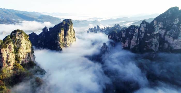 山顶的著名景点有鬼谷栈道上的鬼谷天堑,这里相传是鬼谷子练习轻功的一个地方,还有天悬栈道,栈道建于悬崖绝壁之上,每当这里有云海的时候,我们就像在天上游走一样,惊险刺激的玻璃栈道,大家到了山顶一定要体验一下,当然如果我们胆子小的话,不敢走的话,最好是带块尿不湿哦,天门山也是翼装飞行的圣地,运气好的话还可以看到翼装飞行。