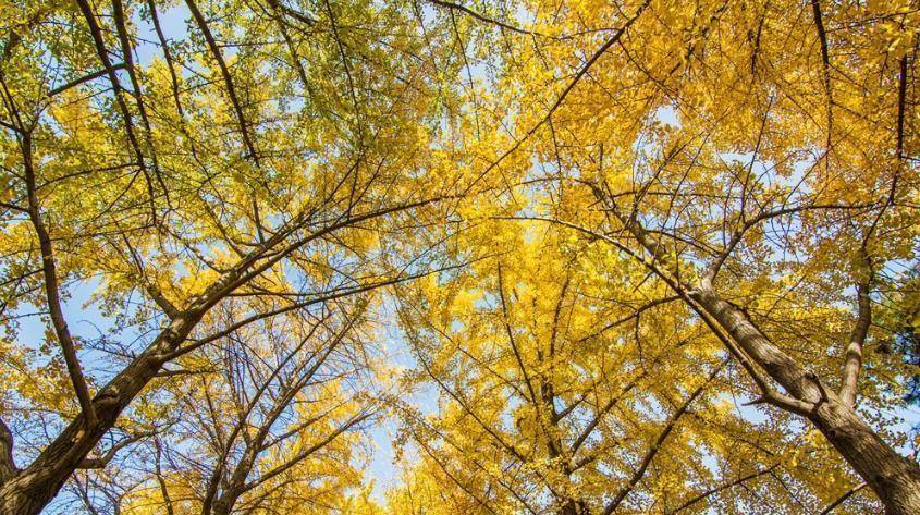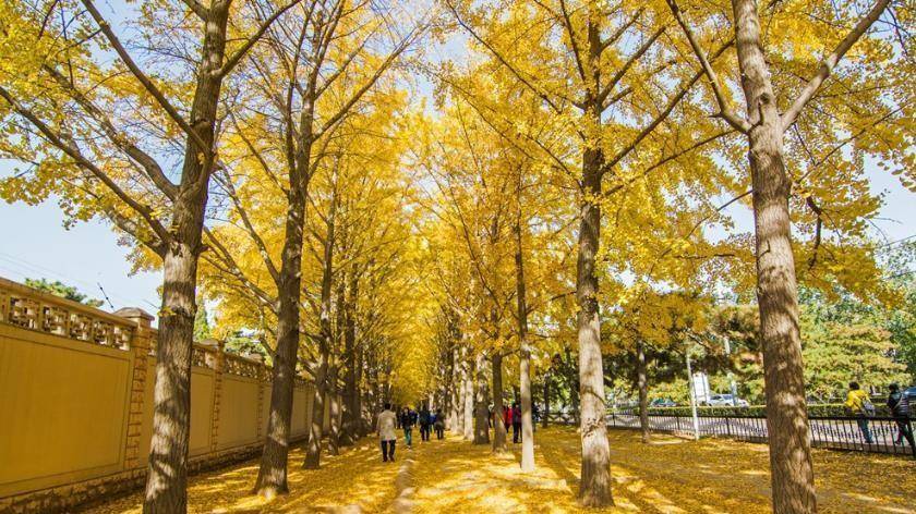 在北京赏银杏用不着大老远往郊区跑,因为在很多地儿都能看着银杏树,而且是出门儿坐地铁就能到,比方说北京人都知道的钓鱼台国宾馆东墙的银杏林,最佳欣赏时间是十一月上旬到十一月中旬,坐地铁一号线木樨地下就成