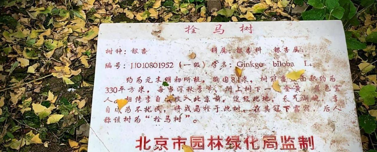 在这颗银杏树脚底下还有一说明碑,相传李自成攻入北京前途径此地,天色渐晚,为了不扰民,就将战马栓于此树,传说当年李自成还躲进了这个树洞里避雨,可见当时这棵银杏树就已经是粗壮的老树了