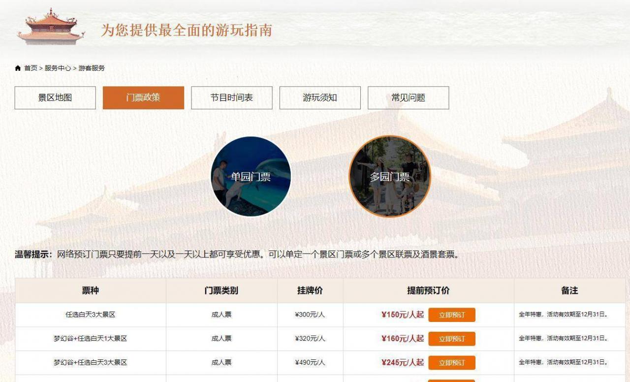 小提示:横店的景区众多,所以门票价格会偏高,秦王宫的门票是165,明清宫苑是155,清明上河园是145,广州街是110,所以我建议买多景点的套票,不如任选3景点的票,300元,任选5大景区的门票是550元,当然所有的门票提前预定都会有优惠,而且是半价!